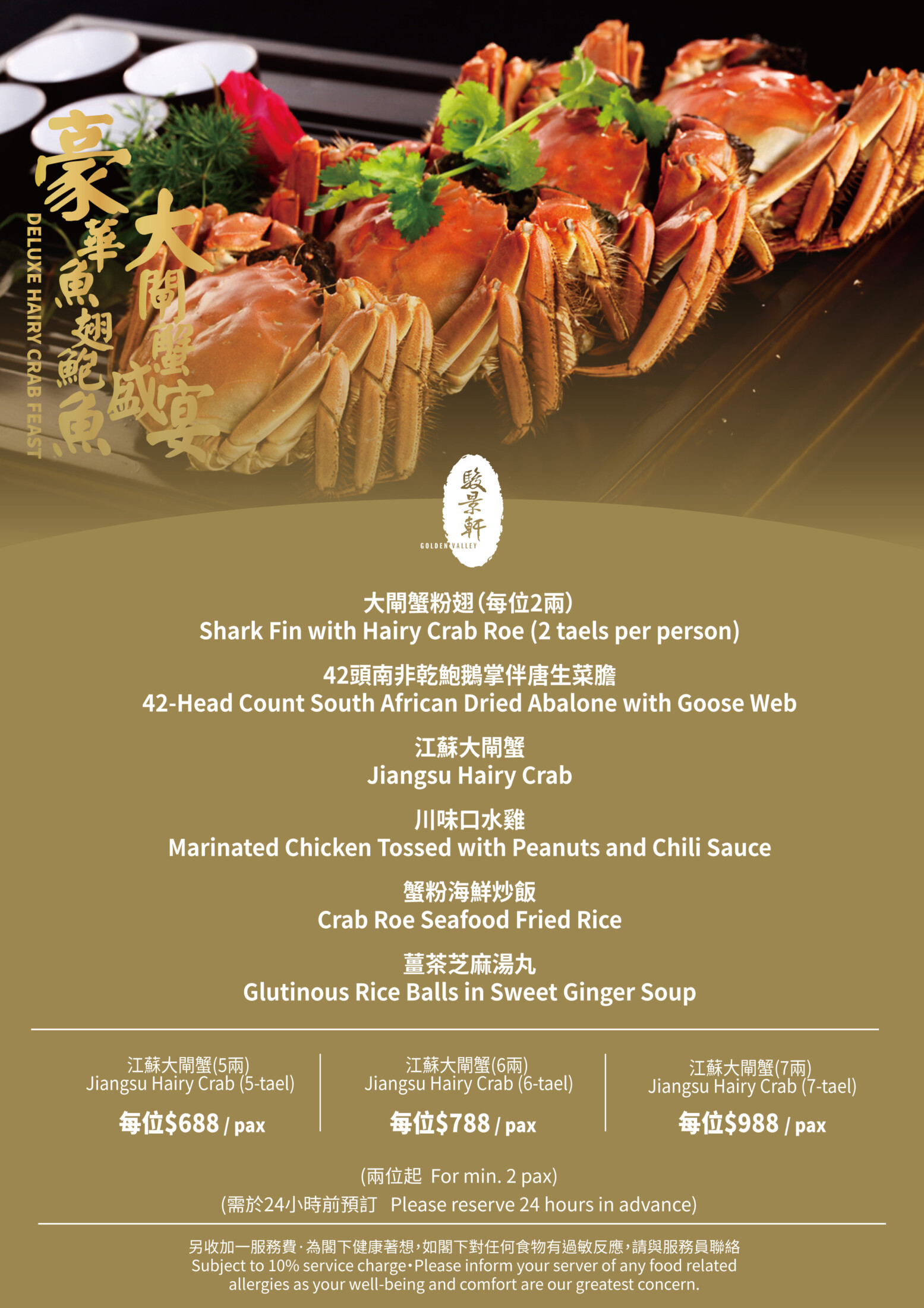 As the crab season reaches its peak, “Golden Valley” presents the “Luxury Hairy Crab Feast”! Featuring premium Jiangsu hairy crabs as the star of the season, this feast is paired with exquisite Cantonese delicacies including “Shark Fin with Hairy Crab Roe”, “South African Dried Abalone with Goose Web”, “Marinated Chicken Tossed with Peanuts and Chili Sauce” and “Crab Ore Seafood Fried Rice”. With the luxurious delicacies and finishing with the warm sweetness of ginger tea glutinous rice balls, every bite harmonizes the freshness of autumn crabs with top-tier ingredients in one spectacular meal.