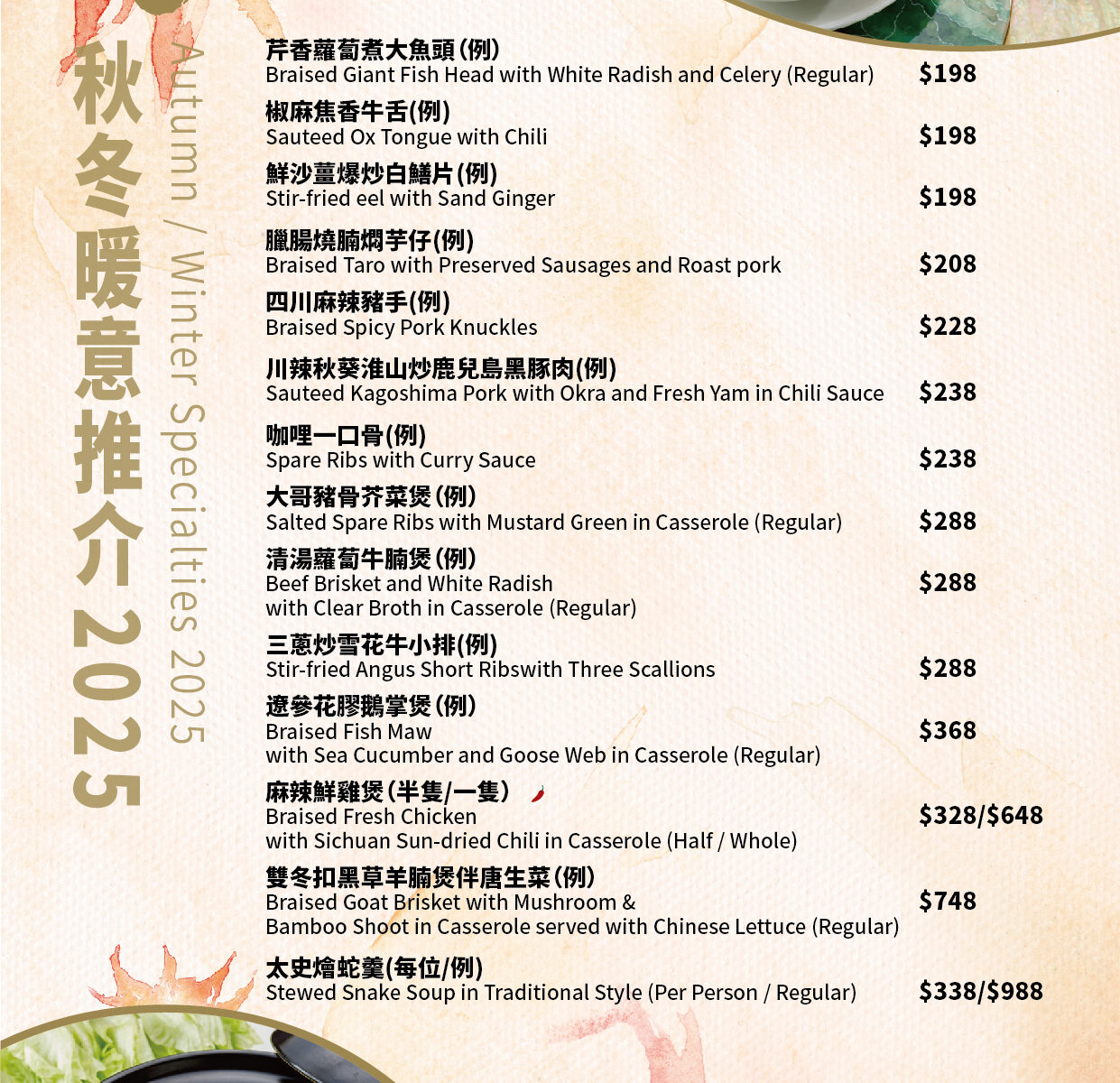 天气乍暖还寒,天文台预测气温又会再急降。骏景轩诚意推出一系列秋冬菜式,推出多款补身菜式如「太史烩蛇羹」、「双冬扣羊腩煲伴唐生菜」及「金蚝鸳鸯肠煲仔饭」等, 以滋补养生的食材融入美食之中,让您在寒冷的季节品尝补身又暖心的滋味佳肴。